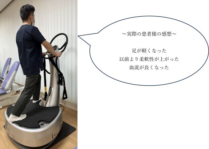 振動の上でストレッチを行うことで、筋肉が緊張して硬くなっていると感覚器官が勘違いし、脳に筋肉を緩める信号を送ることにより、通常よりもストレッチ効果が得られます。
