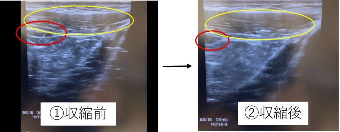 うまく出来ていると上のエコー画像のようになり、表面の筋肉(黄色い○で囲まれた部分)の厚みをあまり変えずにより深層にある腹横筋(赤い○で囲まれた部分)のみが収縮し太く、短くなります。