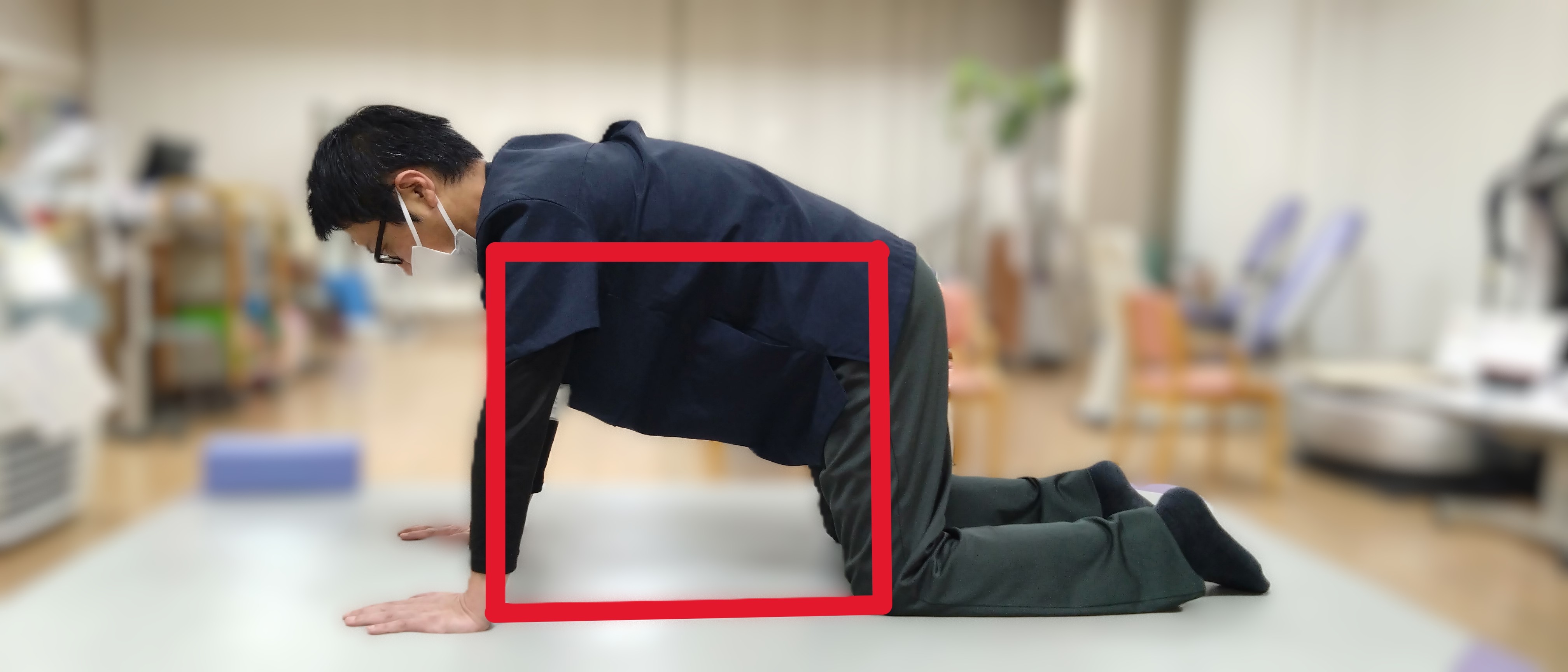 まずスタートの姿勢ですが床と体、手足で四角形になる様に四つ這いになります。