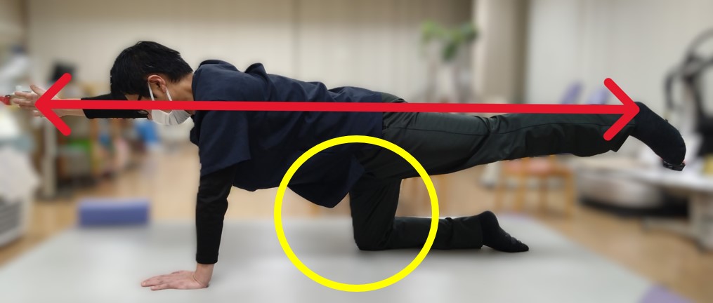 手足を上げている時は身体がグラグラしない様おなかにしっかり力を入れます。